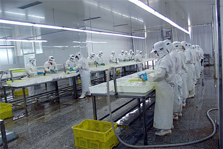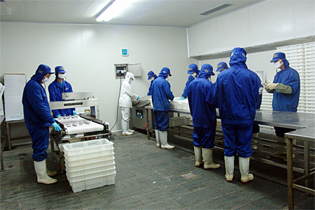 本公司是一家以水產(chǎn)品加工為主的出口型企業(yè),于2004年9月建成并正式投產(chǎn)。公司廠房完全按照歐洲聯(lián)盟的標(biāo)準(zhǔn)設(shè)計(jì)施工,目前占地14000平方米,建筑面積8000平方米,其中加工車間1600平方米。公司日速凍能力達(dá)100噸,儲(chǔ)藏庫(kù)容量為5000噸,主要加工蟹類、貝類、頭足類及魚蝦類水產(chǎn)品,產(chǎn)品銷往日本、東南亞及歐盟地區(qū)。